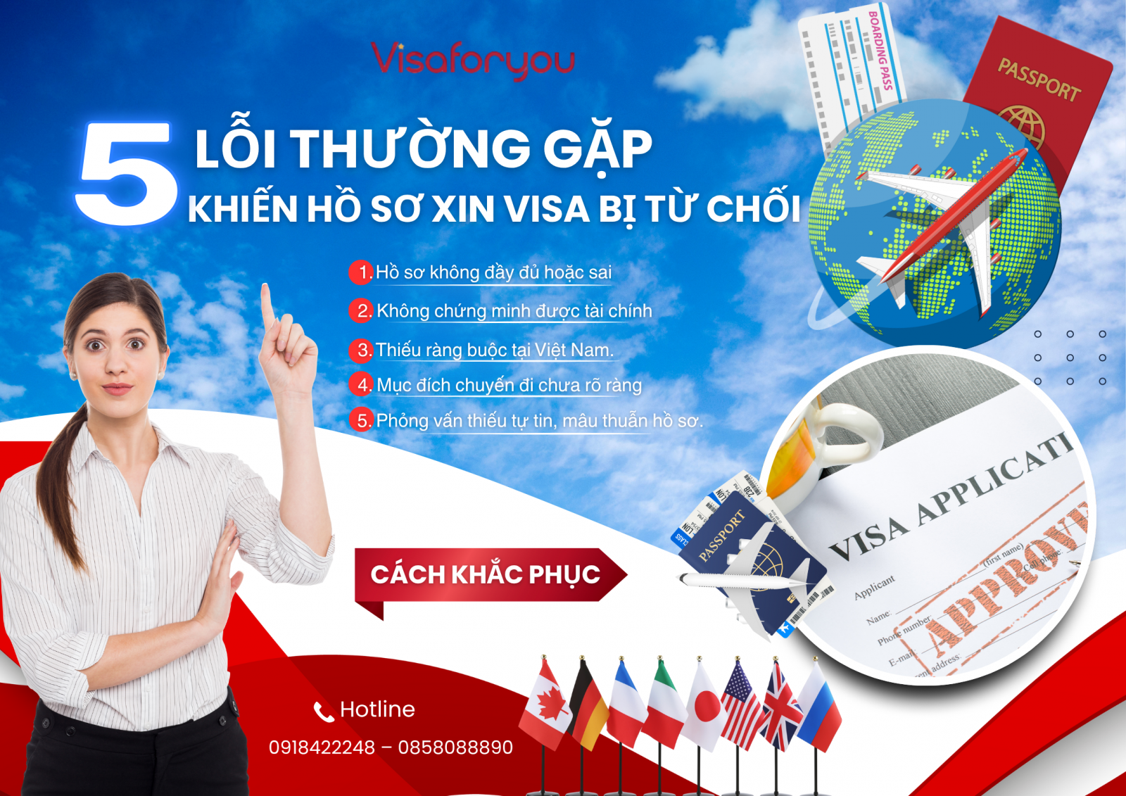 Vì sao lỗi hồ sơ xin visa hay bị từ chối? Tìm hiểu 5 lỗi thường gặp khi xin visa bị từ chối và cách khắc phục chi tiết để tăng tỷ lệ đậu visa cho du lịch, công tác, du học, lao động. Visaforyou hướng dẫn cách khắc phục chi tiết Hotline 0918422248 - 0858088890