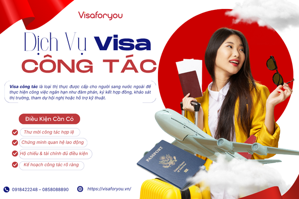 Với dịch vụ làm visa công tác tại Visaforyou, bạn sẽ nhận được sự hỗ trợ toàn diện,nhanh,chính xác, đúng quy trình lãnh sự, giúp chuyến công tác của bạn luôn suôn sẻ và hiệu quả.Liên hệ dịch vụ làm visa qua tổng đài 0918422248 - 0858088890
